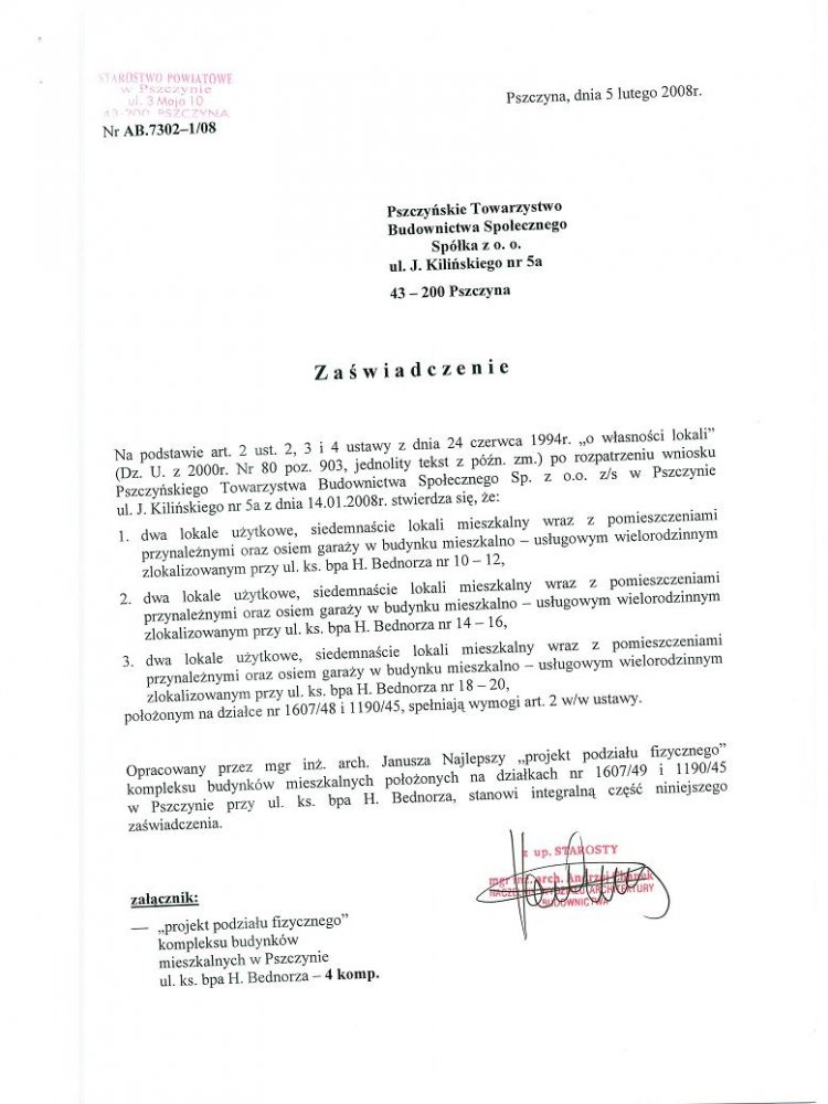 Pszczyńskie Towarzystwo Budownictwa Spółka z ograniczoną odpowiedzialnością informuje, że w dniu 5 lutego 2008 roku uzyskało zaświadczenie Starosty Powiatowego w Pszczynie o spełnieniu przez projekt "podziału fizycznego lokali zlokalizowanych w budynkach przy ul. Bednorza 10-12, 14-16, 18-20" wymogów ustawy z dnia 24 czerwca 1994 roku o własności lokali (decyzja Starosty Powiatowego w wersji elektronicznej). Oznacza to, że możliwa stała się sprzedaż tych lokali ich aktualnym najemcom.